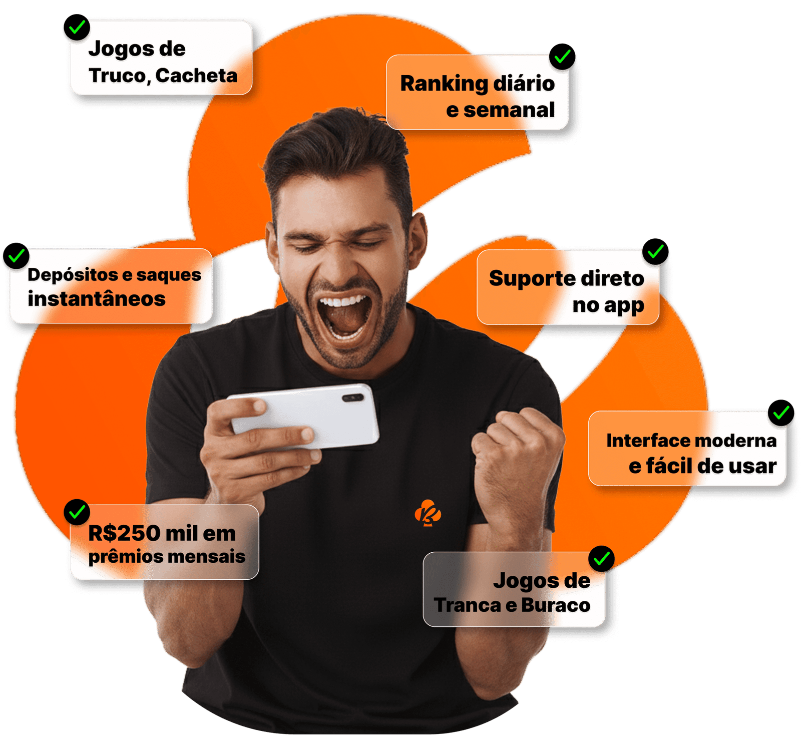 Rankings, prêmios e suporte 100% dentro do app — simples, rápido e seguro.